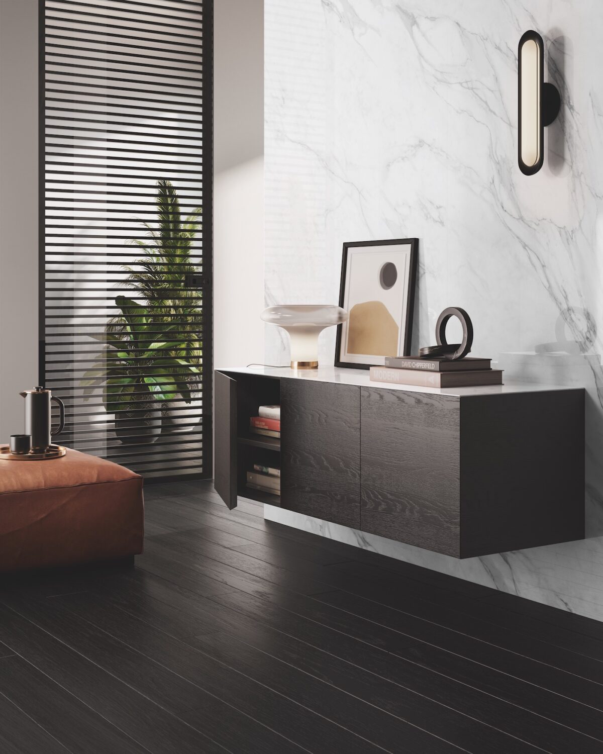 • Boiserie a tutta altezza e a tutta altezza con fughe (perfetta per ambienti moderni ed essenziali)