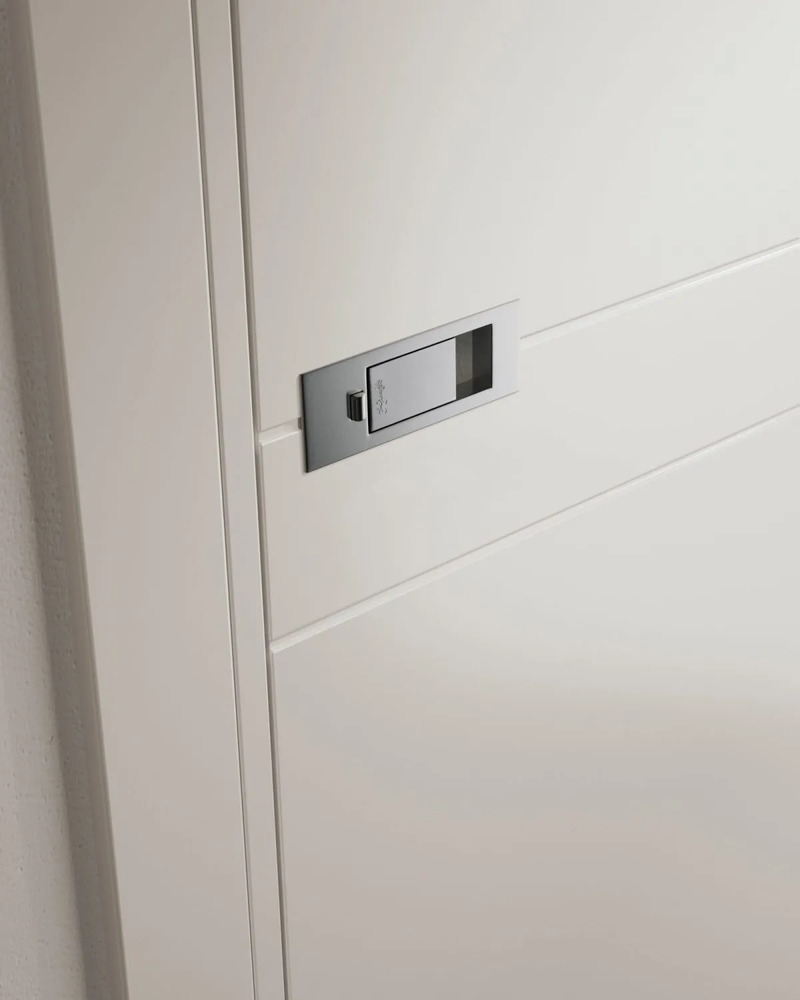 In questo esempio puoi notare una maniglia a vaschetta di forma quadrata, che consente di far scorrere l’anta e di riporla all’interno del vano parete. Per estrarre la porta dal vano è stato montato un tiraporta in tinta con la maniglia.