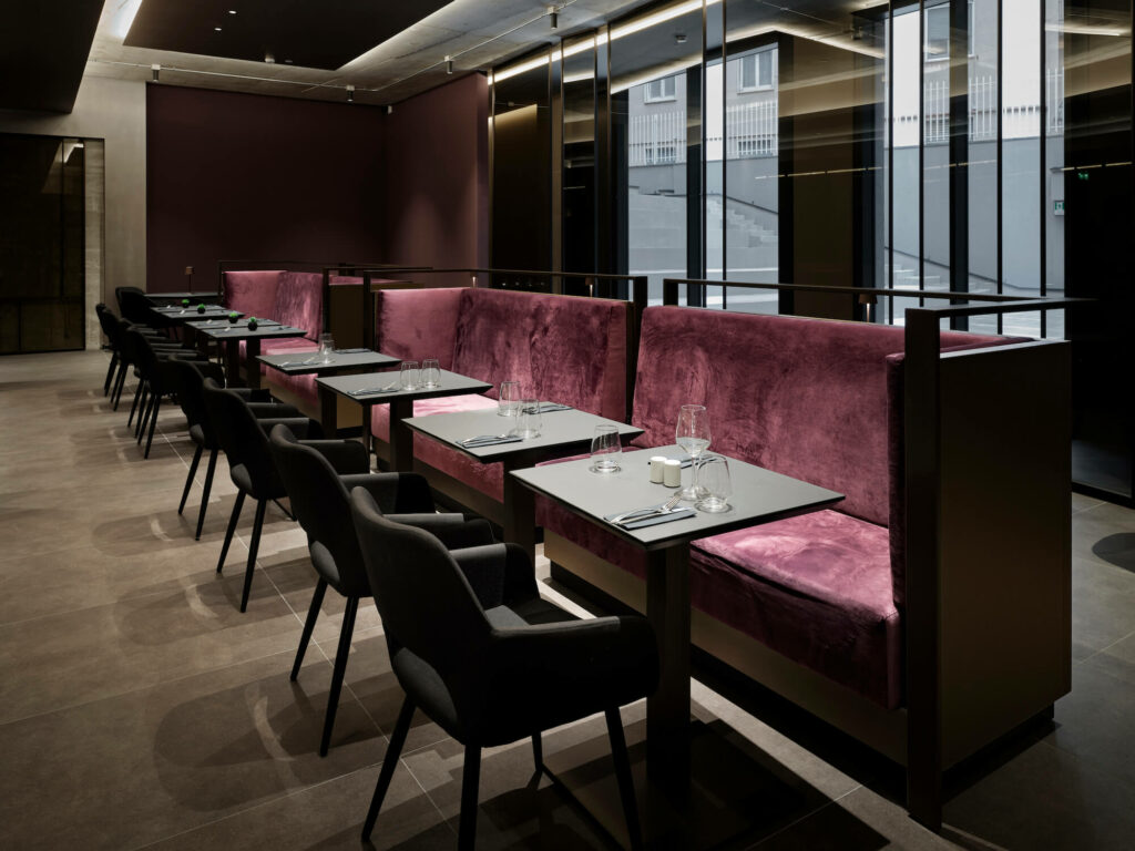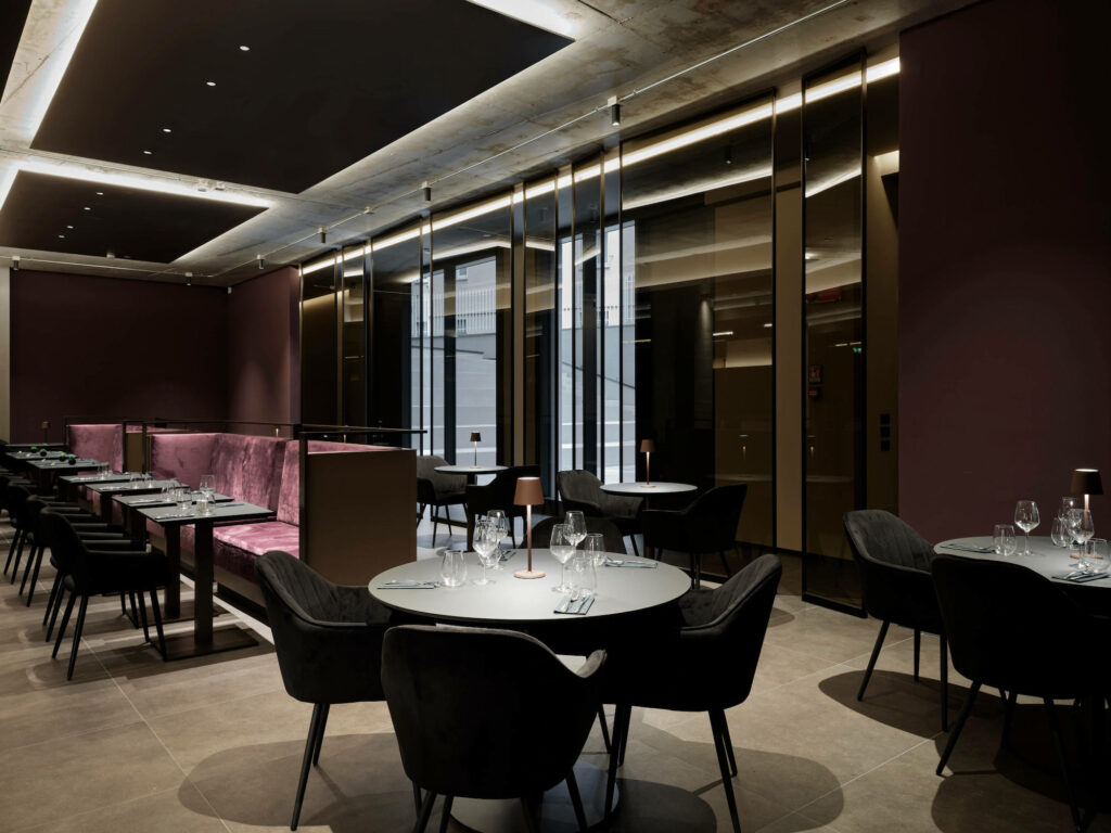 La hall e la sala ristorante rappresentano il cuore dell’esperienza collettiva dell’Hotel Joy124. Qui Garofoli interviene progettando: