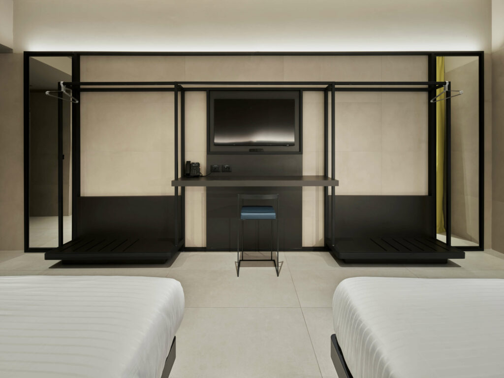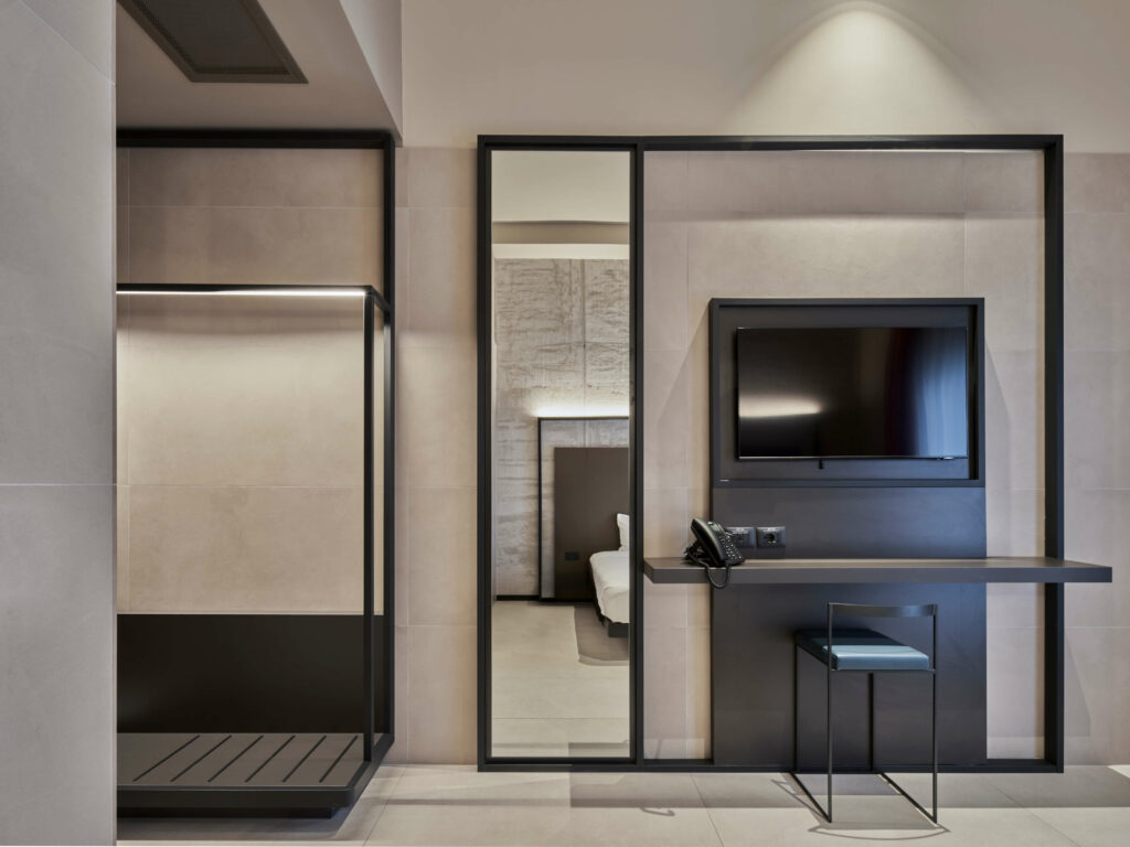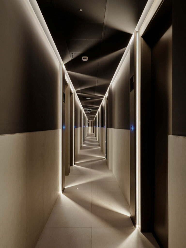 All’interno e all’esterno delle camere dell’Hotel Joy124, la boiserie diventa la trama che unisce i volumi: un rivestimento materico e calibrato che accompagna l’interior in un continuum visivo, amplificato dai sistemi di illuminazione a profili LED, integrati in modo discreto e scenografico.